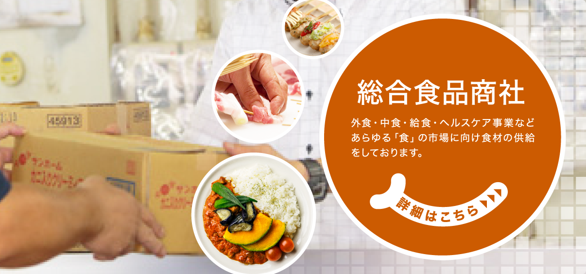 尾家産業は、外食産業向け、中食事業向け工場やオフィスの給食事業向けのほか、ヘルスケア事業向けに至るまで、 非常に幅広い範囲で、あらゆる「食」の市場に食材の供給をはじめ、物流やシステム支援を行なっている総合食品商社です。