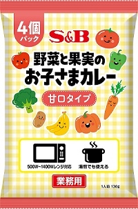 次はエスビー食品の「野菜と果実のお子さまカレー4個パック」。玉ネギやニンジン、トマト、ピーマンなんかの15種類の野菜と、リンゴやバナナなんかの7種類の果物が溶け込んだ甘口カレーやで。具材には国産のジャガイモとニンジンを使ってるねん。高出力の業務用電子レンジでスピーディーに加熱できる(1400Wで15秒)から、むっちゃ便利やわぁ。もちろん家庭用電子レンジや湯煎もできるから、オペレーションに応じて使い分けできるで。